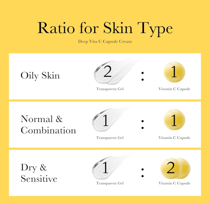 Deep Vita C Capsule Cream is a dual-texture, vitamin-infused moisturizer designed to brighten dull skin, fade dark spots, and even out skin tone. Its innovative formula combines Vitamin C capsules (with stabilized liposome delivery) and a transparent gel base so you can customize the capsule-to-gel ratio to suit your skin’s needs. Infused with 50% Sea Buckthorn extract, 5% Niacinamide, and pure Vitamin C, this cream fights oxidation, restores radiance, and delivers hydration with a non-greasy, glowing finish. Perfect for all skin types, especially those concerned with pigmentation, dullness, and uneven tone.